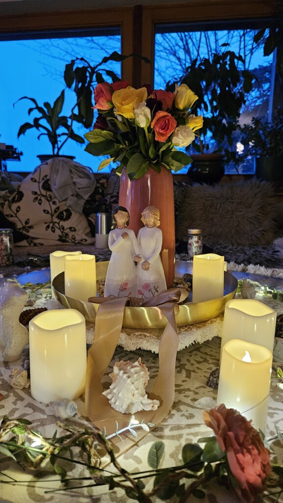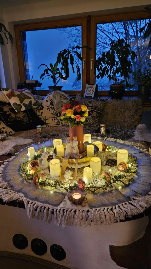 Külön szeretnék beszélni az oltárról is. Az oltárkészítés mindig egy nagyon erős, közös folyamat. Mindenki hoz bele valamit, én is beleteszem a saját energiámat. Az oltár végigkísér minket az egész tábor alatt: van egy nyitása, egy épülése, majd egy zárása. Ciklikus folyamat. Aztán az oltár elemei hazakerülnek, tovább élnek a résztvevők hétköznapjaiban is. Ez számomra mindig csodálatos.